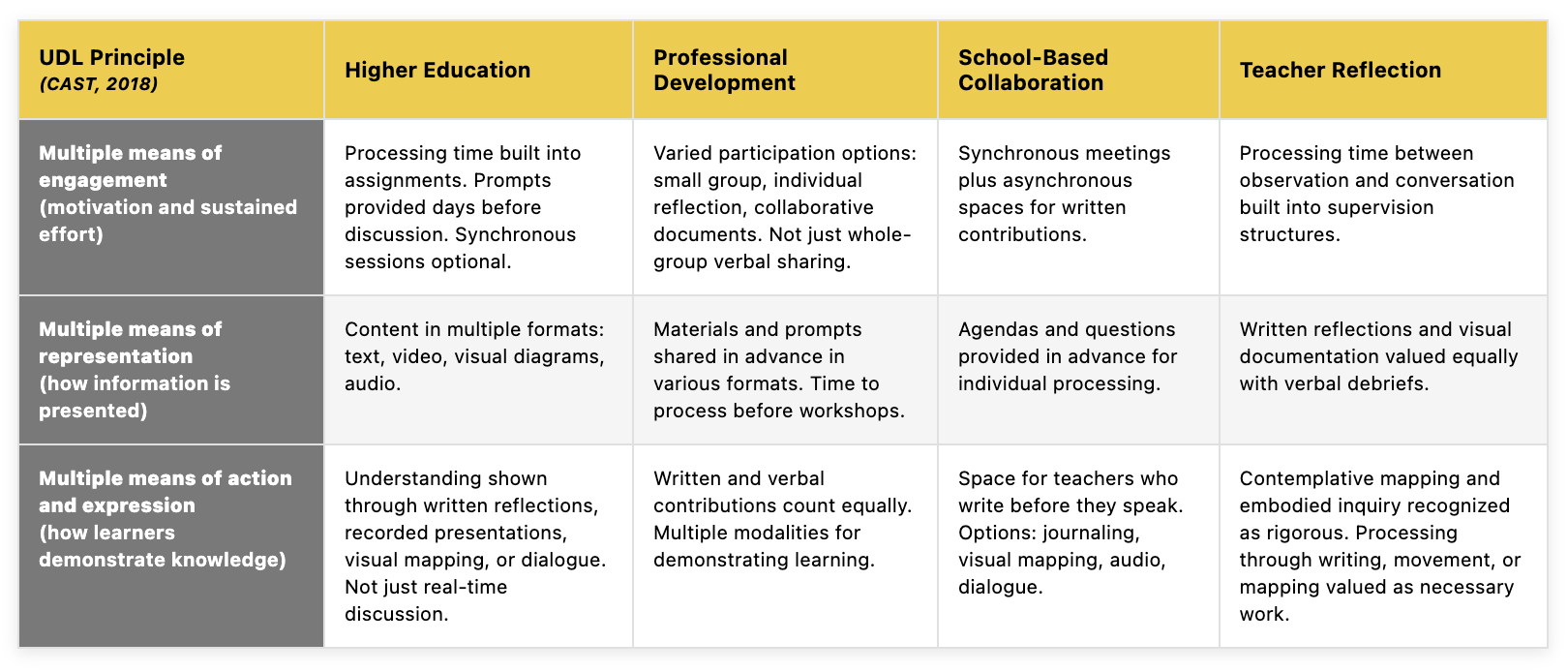 Designing professional learning structures must make space for this synthesis work, this embodied knowing, this development of practitioner self-awareness. UDL provides the framework for building these practice architectures.