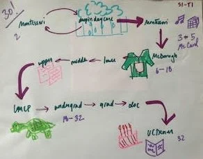 The second map presents a more conventional narrative of my educational journey - an occasional daycare I hated, a nurturing Montessori program, 1st to 12th grade at a private school with a uniform, and then the University of Maryland, my professional home where I earned my bachelors, master, and doctorate before moving on to my postdoc out west. This second map was organized, purposeful, and showed growth.