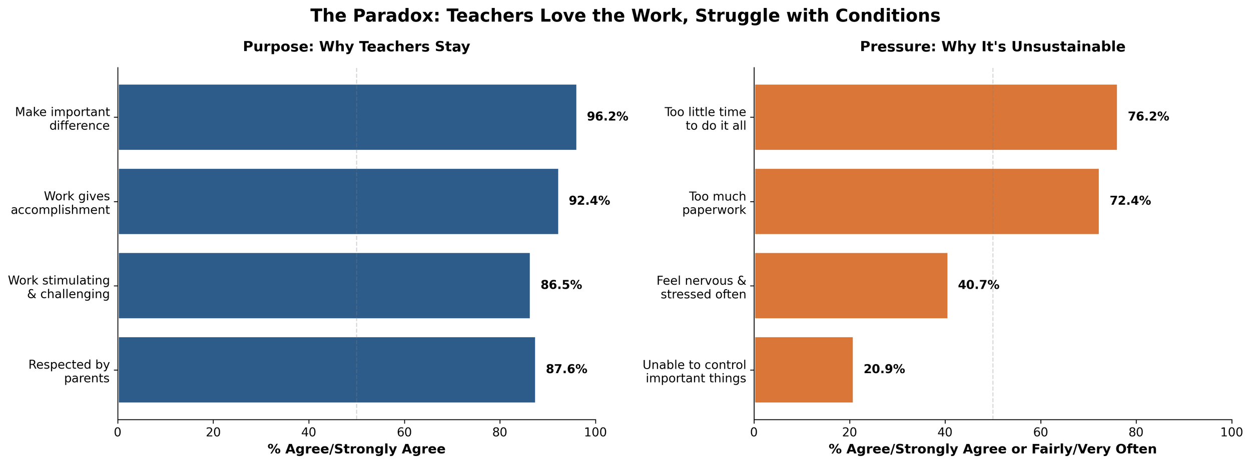 Side-by-side bar charts showing the paradox of teacher experience. Left side shows purpose (blue bars): 96% make important difference, 92% feel accomplishment, 87% find work stimulating, 88% feel respected by parents. Right side shows pressure (orange bars): 76% have too little time, 72% report too much paperwork, 41% feel stressed often, 21% unable to control important things.